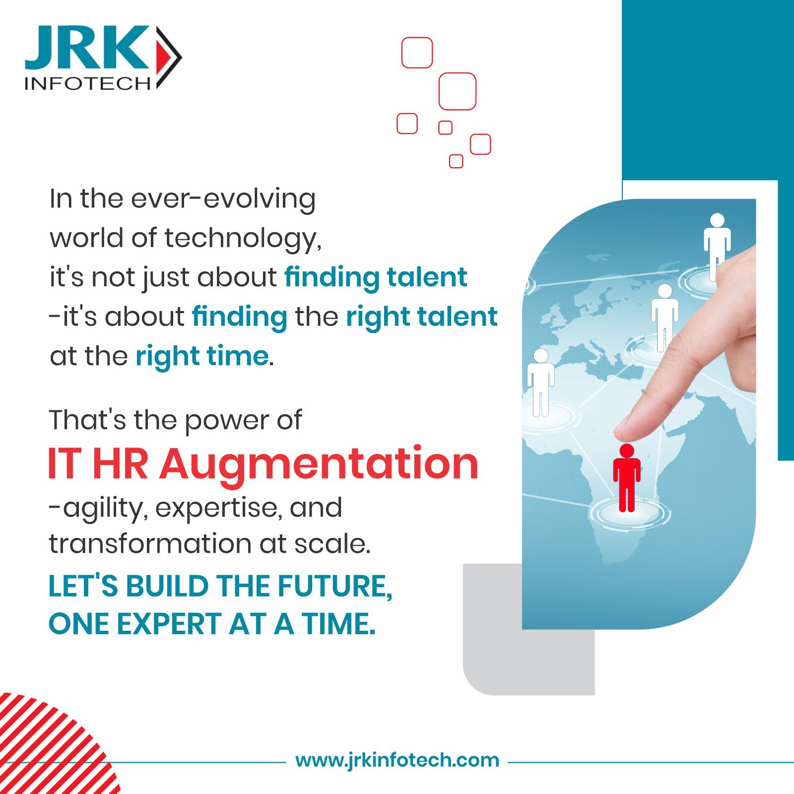 At JRK Infotech, we specialize in providing tailored IT HR Augmentation solutions for enterprises of all sizes. Whether you need a team of developers for a short-term sprint or a specialist in cybersecurity for a long-term transformation, we’ve got you covered.